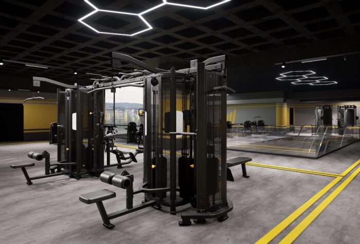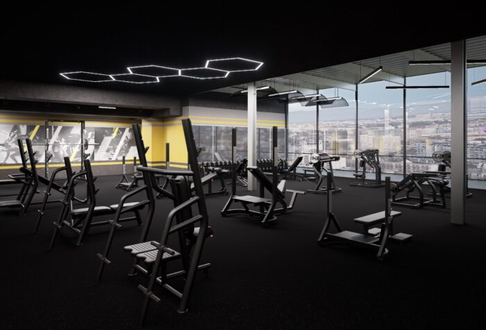 Etajul superior găzduiește o zonă de fitness cu lumină naturală și echipamente variate pentru antrenamente de forță și tonifiere. În plus, sala este dotată cu vestiare moderne, un Healthy Shop, acces prin aplicație și antrenori specializați care oferă suport personalizat.